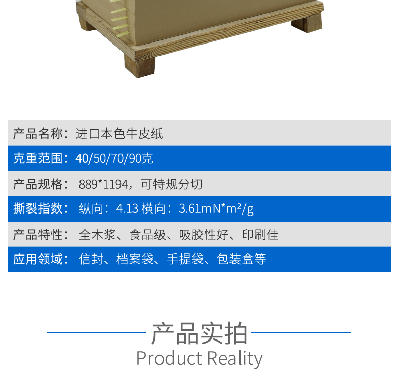 【克重范圍】: 40/50/70/90克 【產(chǎn)品規(guī)格】: 889*1194,可特規(guī)分切 【撕裂指數(shù)】: 縱向:4.13 橫向:3.61mN*m2/g 【產(chǎn)品特性】: 全木漿、食品級、吸膠性好、印刷佳 【應用領域】: 信封、檔案袋、手提袋、包裝盒等